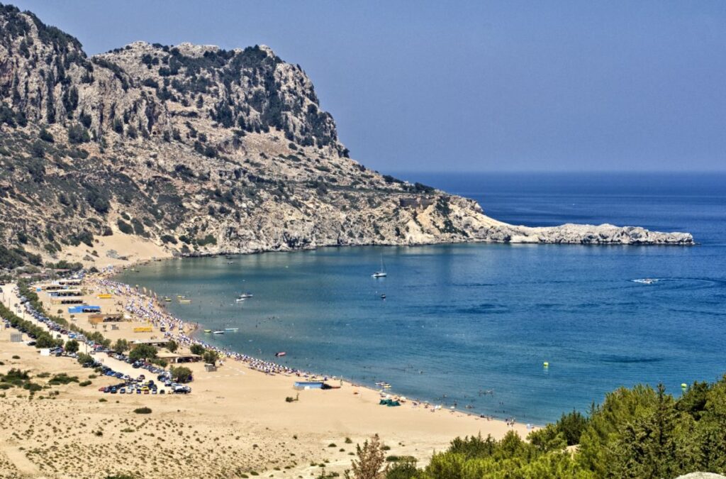 Tsambika beach is long and broad with fine, golden sand and dozens of colourful little flags marking out the various eating establishments and beach sports centers. Tsambika is one of the most beautiful beaches on Rhodes.